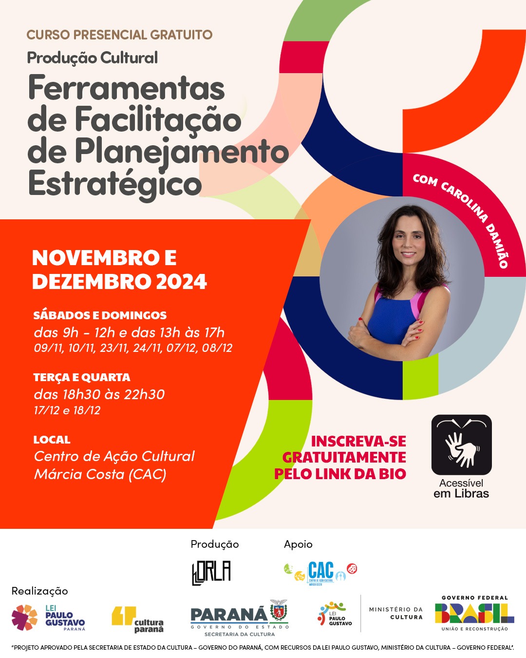 Em novembro e dezembro de 2024, no CAC Márcia Costa, em Maringá/PR, será realizado o curso “Produção Cultural, Ferramentas de Planejamento Estratégico” ministrado pela produtora, atriz e escritora Carolina Damião, com recursos da Lei Paulo Gustavo.