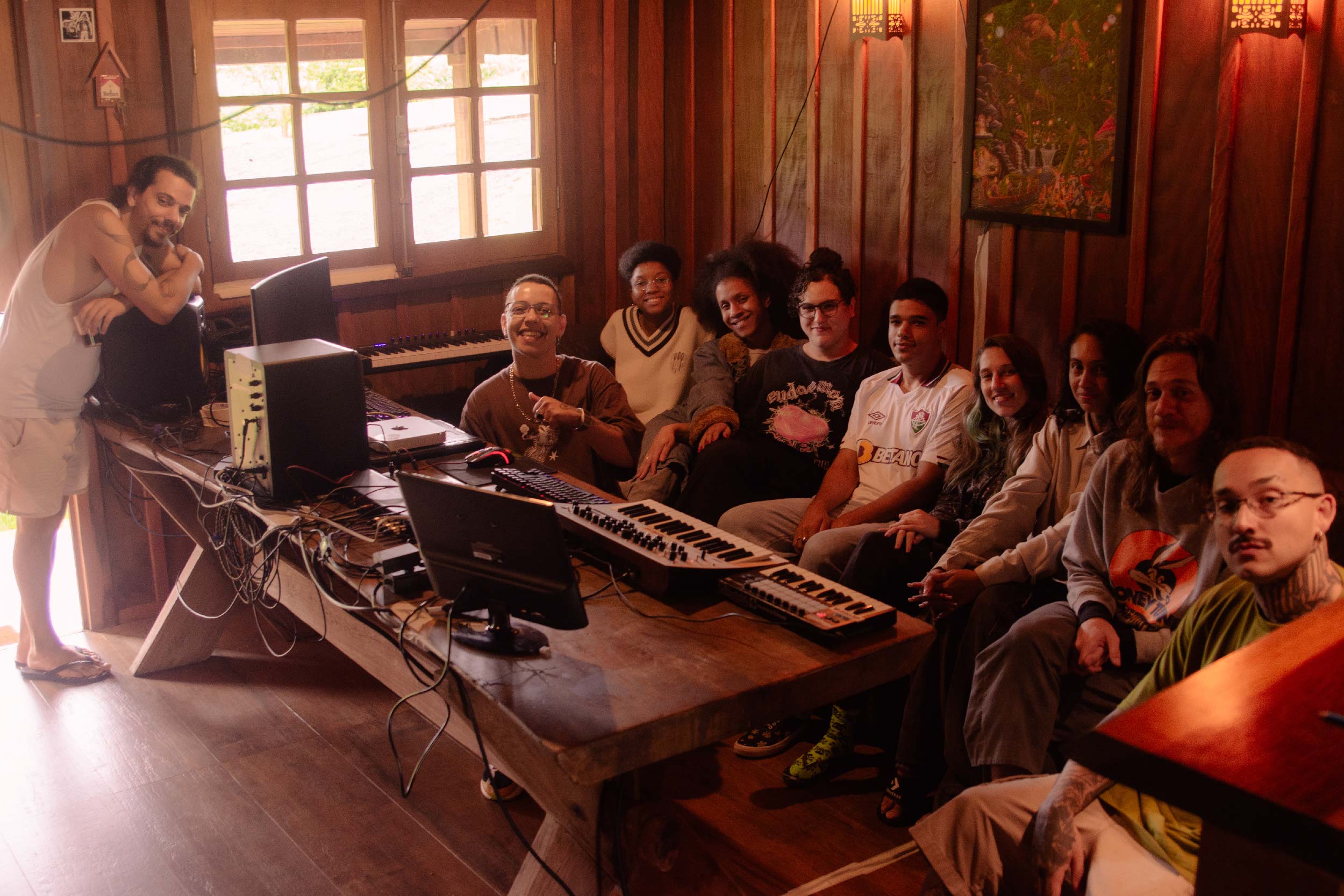 A residência, que aconteceu na Casa da Madera, teve início com uma série de oficinas formativas que serviram como ponto de partida para moldar o processo criativo. Os residentes participaram de encontros sobre expressão corporal e prática de grupo com Victor Lovato; escrita e composição com Mayara Blasi; instrumentos virtuais com Chá di Lirian; e voz e performance com Ariadine Gomes. Essas oficinas contribuíram para fortalecer a conexão entre os artistas e desbloquear novas formas de criação.