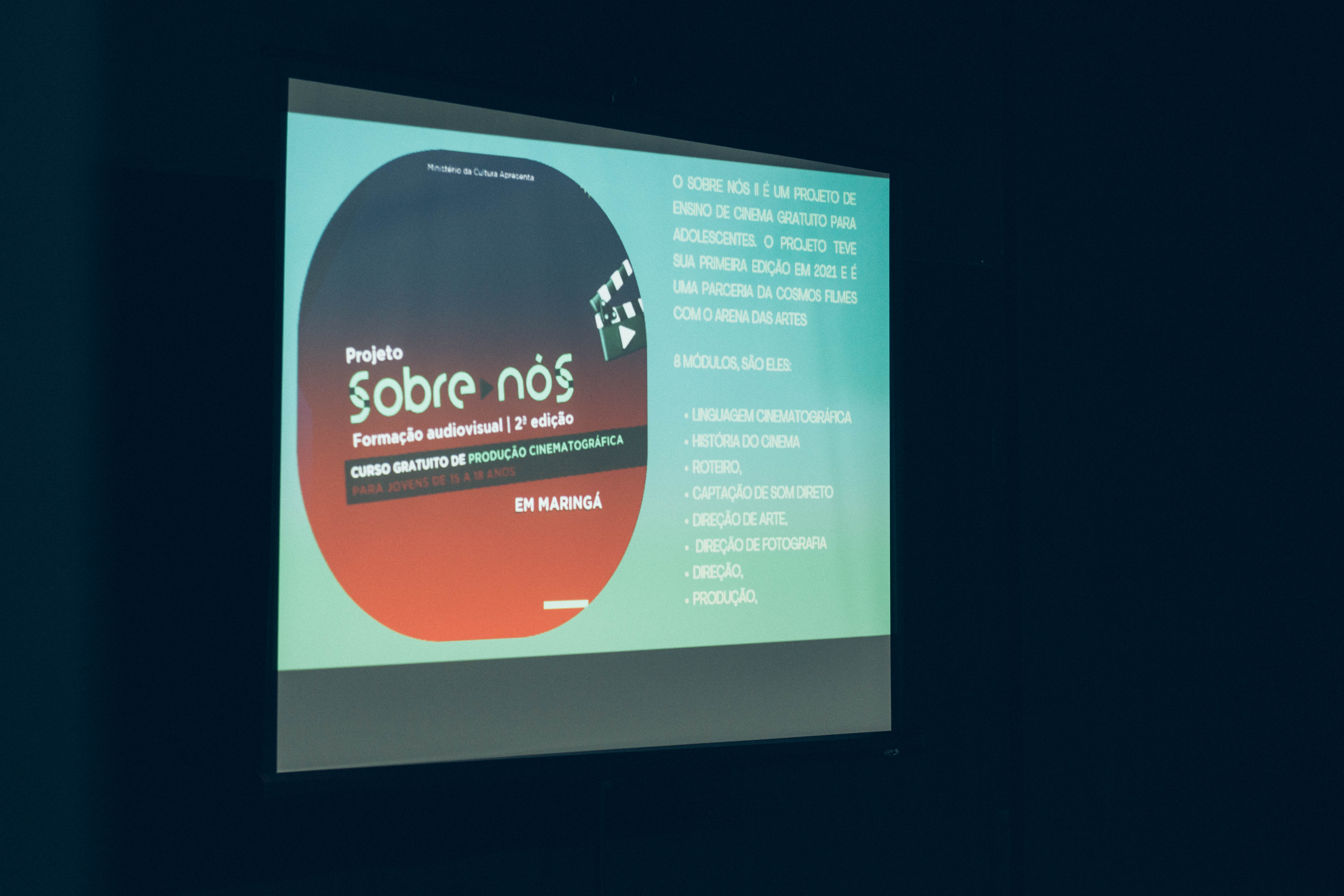 O projeto Sobre Nós – Formação Audiovisual 2ª edição, promovido pela Cosmos Filmes em parceria com o Arena das Artes, começou em novembro de 2022 com três minicursos para profissionais da área do audiovisual. Na época foram oferecidos os cursos de Produção Executiva, Interpretação para o Cinema e Direção de Arte. Para cada uma das formações foram oferecidas 20 vagas, gratuitas, que foram preenchidas rapidamente. Esta etapa do projeto é de qualificação e aperfeiçoamento de profissionais que já trabalham com audiovisual, em específico com cinema. Foi uma etapa também para network e intercâmbios de experiências, pois os instrutores dos cursos de produção executiva e direção de artes são de Londrina.